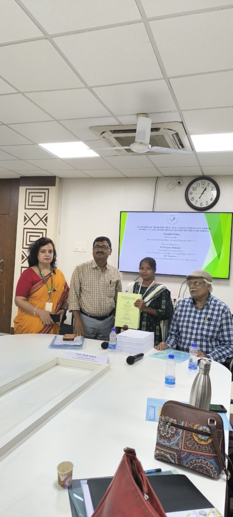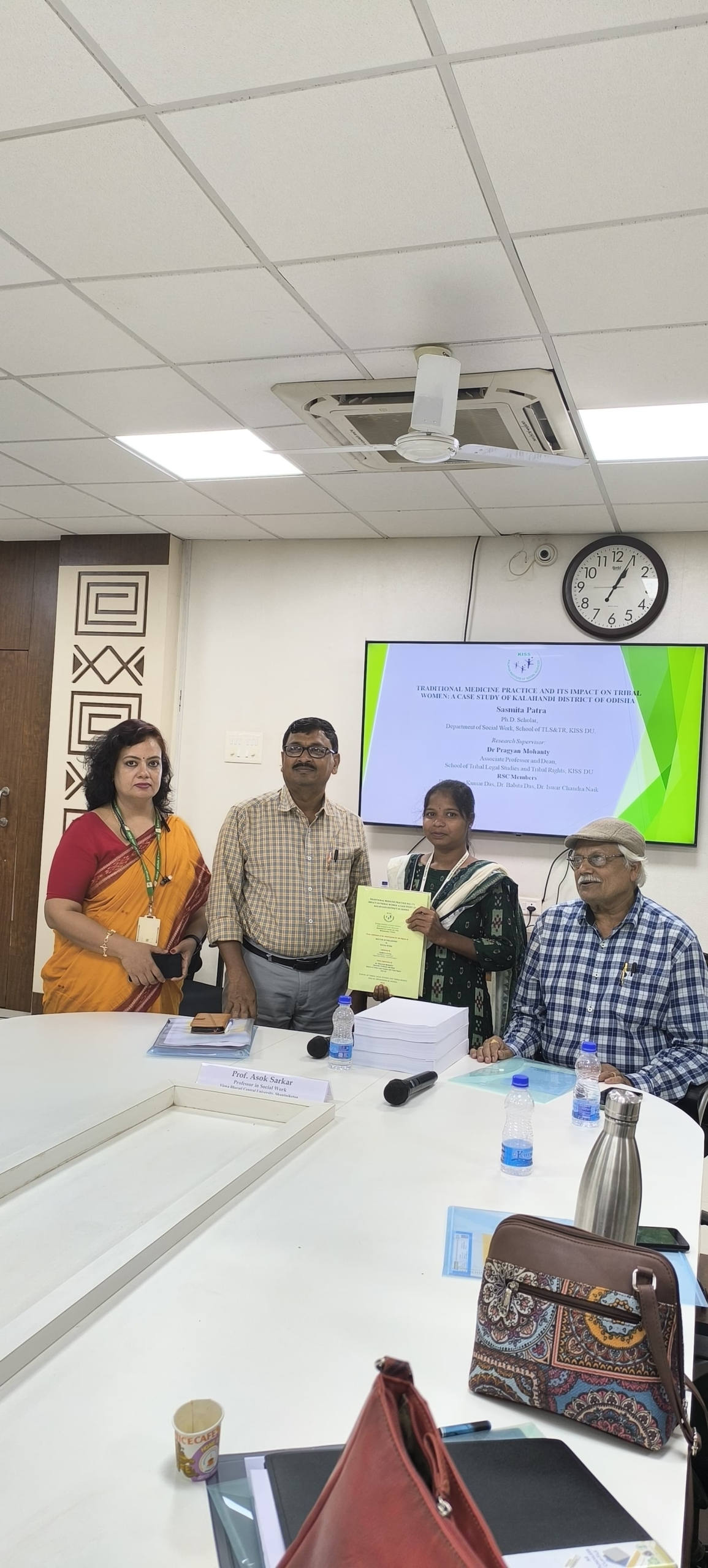 The defense was graced by the External Examiner Professor Asok Kumar Sarkar, Department of Social Work, Viswa Bharati Central University of Shantiniketan. Dr. Patra belongs to the Gond Tribe of Odisha and has the credit of being the first Ph.D. holder in her entire Panchayat. She belongs to the Kalahandi District of Odisha and in a personal interaction, she expressed the desire to pursue a career in teaching and be a change maker by initiating policy changes in the area of traditional medicine.