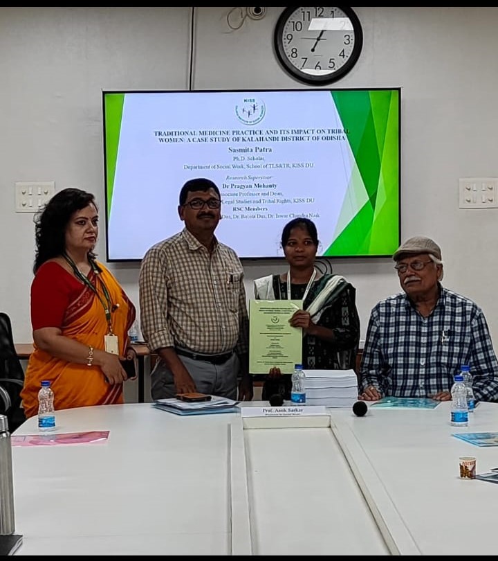 Ms. Sasmita Patra Ph.D. Scholar of Social Work, School of Tribal Legal Studies and Tribal Rights, (TLSTR) KISS-DU was awarded Ph.D. on 23rd September 2024. The title of her thesis was “Traditional Medicine Practice and its Impact on Tribal Women: A Case Study of Kalahandi District of Odisha” under the supervision of Dr. Pagyan Mohanty, Associate Professor and Dean, STLSTR, KISS-DU.