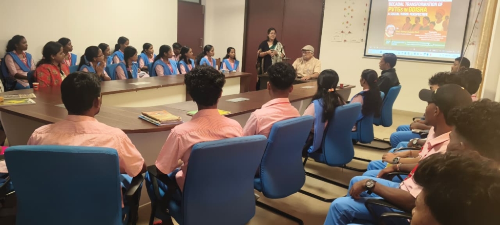 The Department of Social Work, School of Tribal Legal Studies and Tribal Rights, Kalinga Institute of Social Sciences (KISS), organised a special lecture on “Decadal Transformation of Particularly Vulnerable Tribal Groups (PVTGs) in Odisha” on 27 November 2025 at the Library Conference Hall. The session was delivered by Prof. N. C. Dash, Professor Emeritus at KISS-DU, an eminent scholar in tribal studies, who shared insightful perspectives on the socio-economic transitions among PVTGs over the last decade.