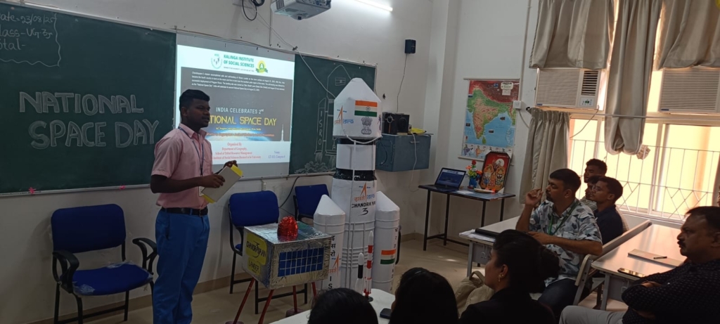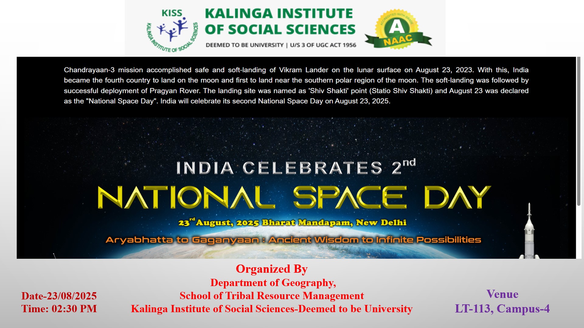 The Department of Geography, School of Tribal Resource Management (STRM), KISS-DU, celebrated the 2nd National Space Day on 23rd August 2025 to mark the historic achievement of Chandrayaan-3’s successful soft landing on the Moon’s south pole in 2023.The programme began with a warm Welcome Address by Dr. Monalisha Mishra, Head of the Department of Geography, who highlighted the importance of National Space Day and this year’s theme, Aryabhatta to Gaganyaan: Ancient Wisdom to Infinite Possibilities.” She emphasized how space technology has revolutionized the field of geography by enhancing environmental monitoring, disaster management, and climate studies.