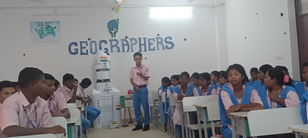 The occasion was graced by Mr. Subhendu Kumar Mohanty, Additional Director, Student Affairs, KISS-DU, as the Chief Guest. In his inspiring address, he explained the idea of “Yesterday, Today, and Tomorrow”, stressing the need to value the present and work with dedication to shape a better tomorrow. Dr. Arpana Premi Lina Oraon, Dean of STRM, encouraged students to aim high and nurture both academic and personal excellence. Dr. Somanath Mishra, Assistant Professor, B.Voc., further motivated students with his insights on preparing for future opportunities with determination and resilience. Adding an academic spark to the event, Mr. Ajoy Chakma, U.G 2nd year Geography student, presented an informative talk on the Chandrayaan-3 mission, its objectives, achievements, and significance for India’s space journey. A beautifully designed space model, prepared by P.G 2nd year Geography students, became the highlight of the programme and received great appreciation from everyone.