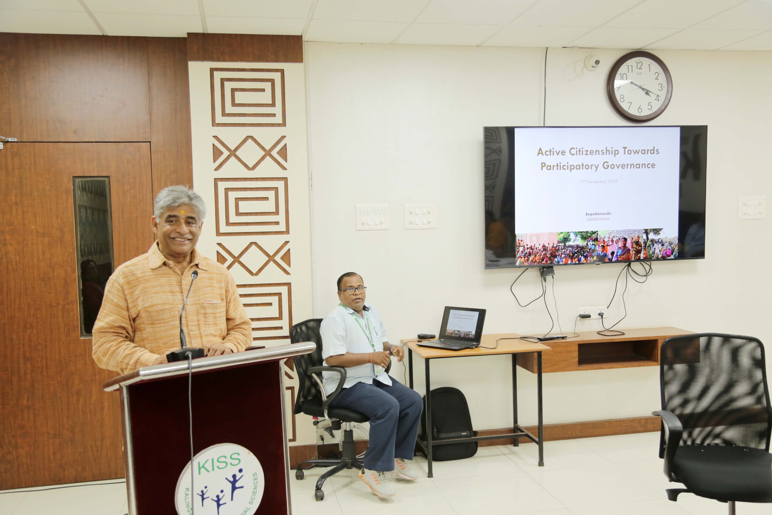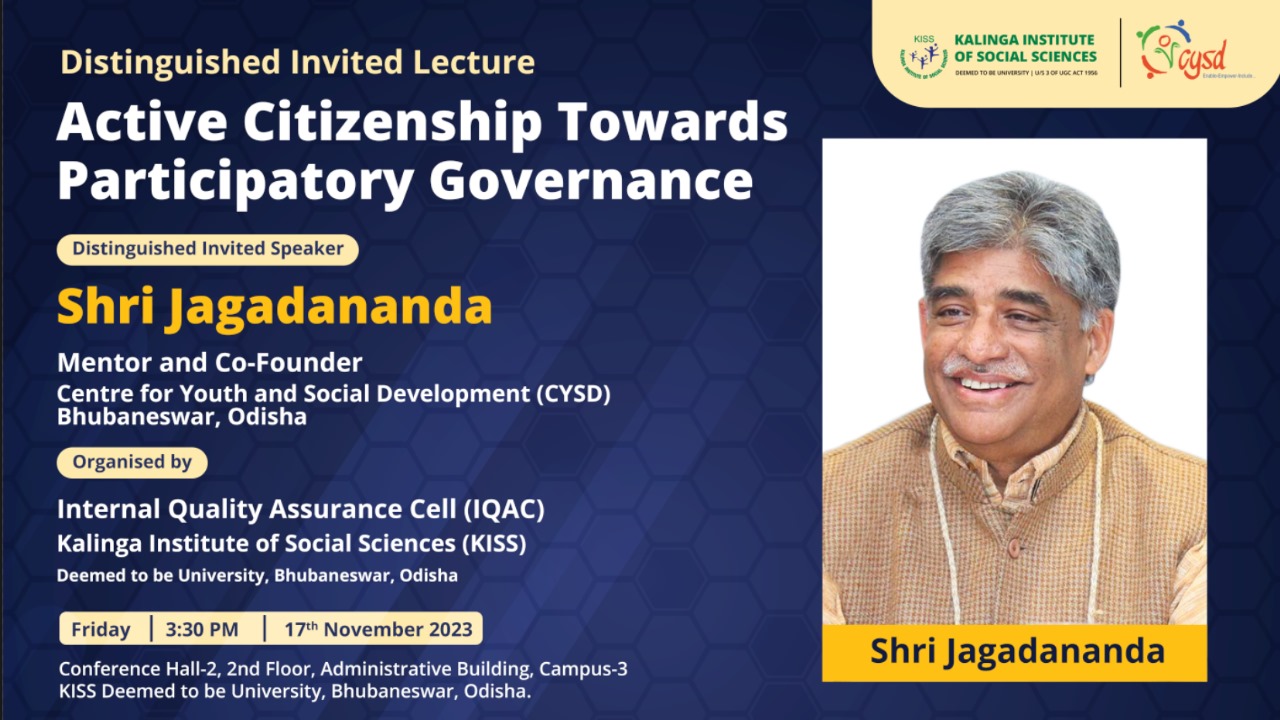 On the occasion, Shri Jagadananda, Mentor and Co-Founder, CYSD in his address said “This MoU is very important because of the commonalities in both institutions. Sharing his personal experience, he said that when you dive deeper into community level and getting at ground zero is important. He also delivered an invited lecture on “Active Citizenship Towards Participatory Governance” as an initiative to make the MoU functional. While delivering on the topic he presented in detail the three cornerstones of Participatory Governance: Participation; Transparency and Accountability. He highlighted the changing role of citizens from silence to voice by citizens; quantify voice and feedback and most importantly from reaction to informed action. He concluded by envisioning organizing some activities in the future like Community-based Participatory Research (CPBR), Immersion Programmes and Internship Programmes and Faculty Development Programmes