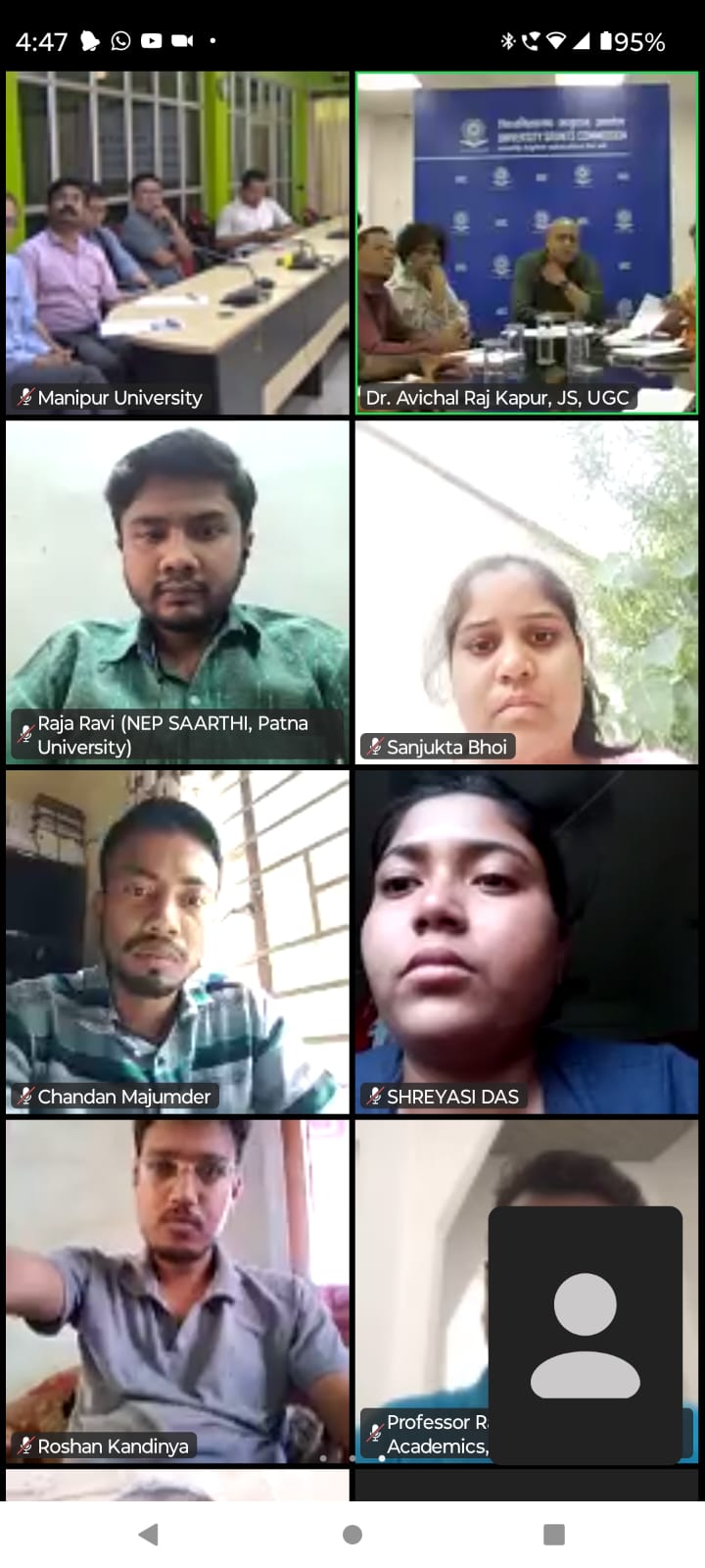 A virtual meeting of Student Ambassador for Academic Reforms in Transforming Higher Education in India (NEP SAARTHIs) of North East and Eastern zone was convened by the University Grants Commission (UGC) under the chairmanship of Dr. Avichal Raj Kapoor, Joint Secretary of UGC. The meeting witnessed the participation of approximately 65 SAARTHIs from different universities of North East and eastern zone .