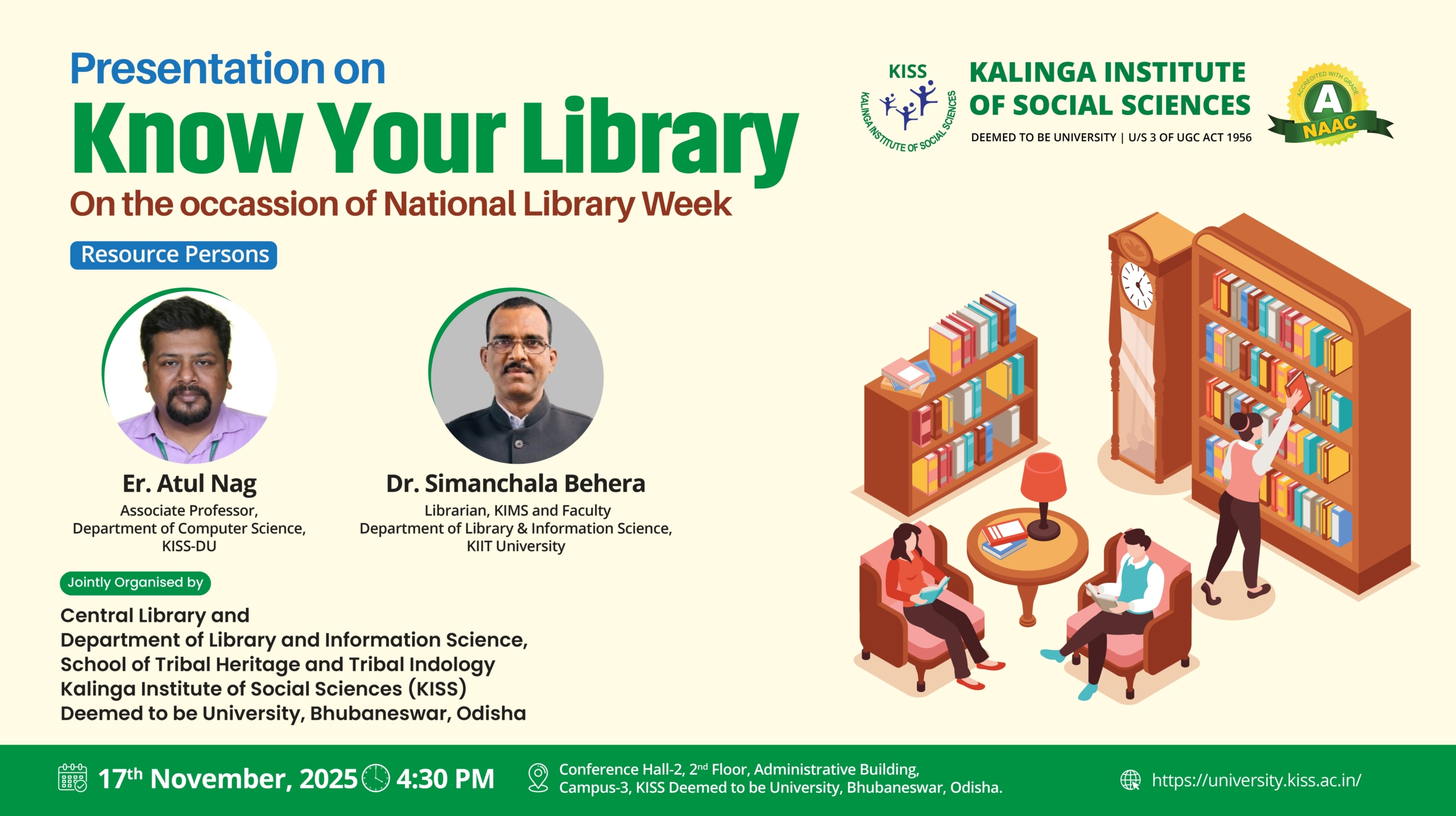 The programme “Know Your Library”, held on 17th November, aimed to familiarize users with the wide range of resources and services offered by the KISS-DU Library. On this occasion, Er. Atul Nag, Associate Professor, KISS-DU, and Dr. Simanchala Behera, Librarian, KIMS & Faculty, Department of Library and Information Science, KIIT University delivered detailed presentations on the available learning tools and the methods for accessing them effectively. Mr. Kalandi Charan Swain, Assistant Chief Librarian, KISS-DU proposed the vote of thanks.