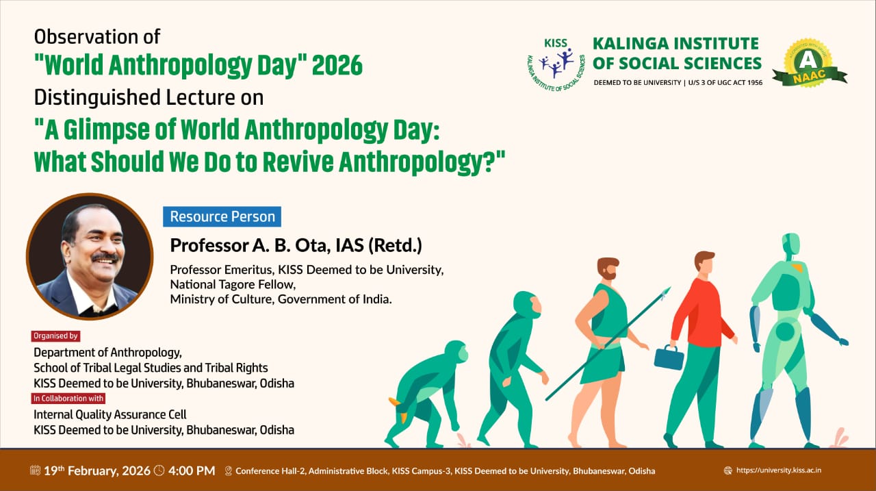 World Anthropology Day was observed at KISS Deemed to be University, Bhubaneswar, on 19th February 2026 with great enthusiasm and academic spirit. To mark the occasion, a distinguished lecture titled “A Glimpse of World Anthropology Day: What should we do to revive Anthropology?” was organized. The programme was jointly organized by the Department of Anthropology, School of Tribal Legal Studies and Tribal Rights (STLTR) and the Internal Quality Assurance Cell (IQAC), KISS Deemed to be University (KISS-DU) with the participation of faculty members, students, and invited guests.
