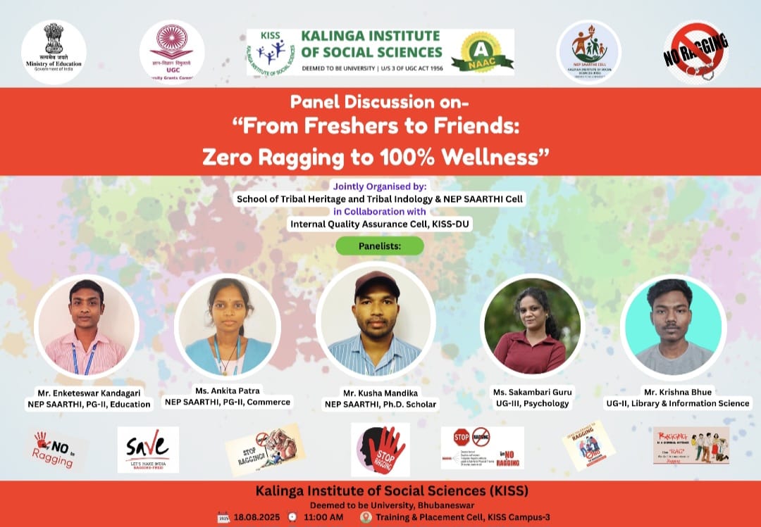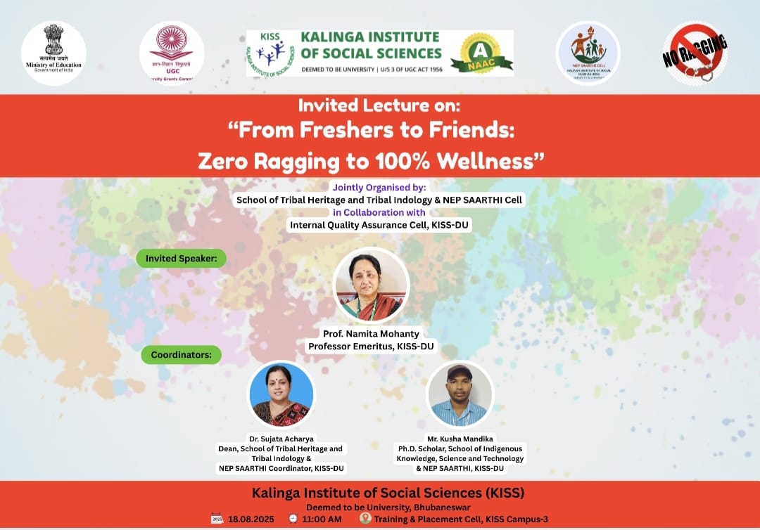 The School of Tribal Heritage and Tribal Indology, jointly with NEP SAARTHI, and in collaboration with the Internal Quality Assurance Cell (IQAC), KISS-DU organized an Invited Lecture on the topic “From Freshers to Friends: Zero Ragging to 100% Wellness” on 18th August,2025 at 11am. This was a part of the observation of the Anti-Ragging Week.