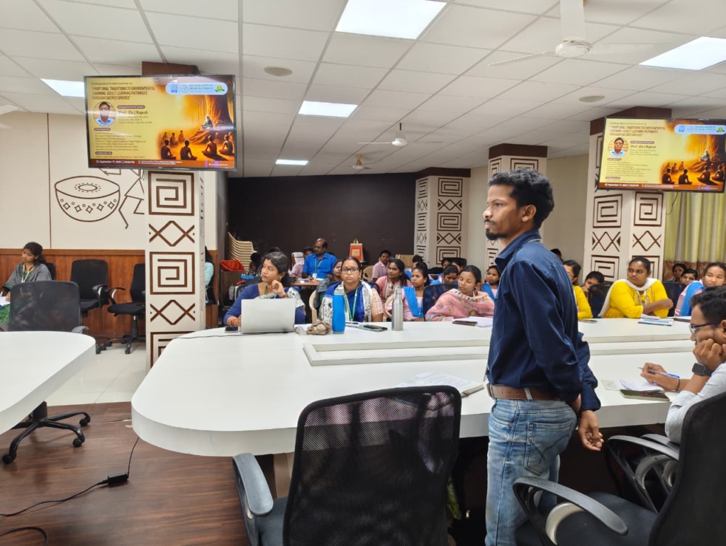 The keynote lecture by Prof. (Dr.) Rajesh was the central highlight of the event. In his scholarly yet engaging presentation, he discussed the critical role of tribal education in shaping the future of the nation. He pointed out that educating marginalized communities is not merely a social responsibility but also a prerequisite for inclusive national development. Drawing attention to the wealth of Indigenous knowledge systems, he explained how sacred groves act as cultural and ecological reservoirs that teach lessons in harmony, sustainability, and respect for nature.