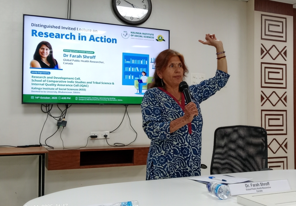 The Research and Development Cell (R&D Cell) in collaboration with the School of Comparative Indic Studies and Tribal Science (SCISTS) and Internal Quality Assurance Cell (IQAC), KISS-DU jointly organized an international Distinguished Invited Lecture on “Research in Action” on 14th October 2025. Dr. Farah Shroff, a renowned global public health researcher from Canada was invited as the resource person.