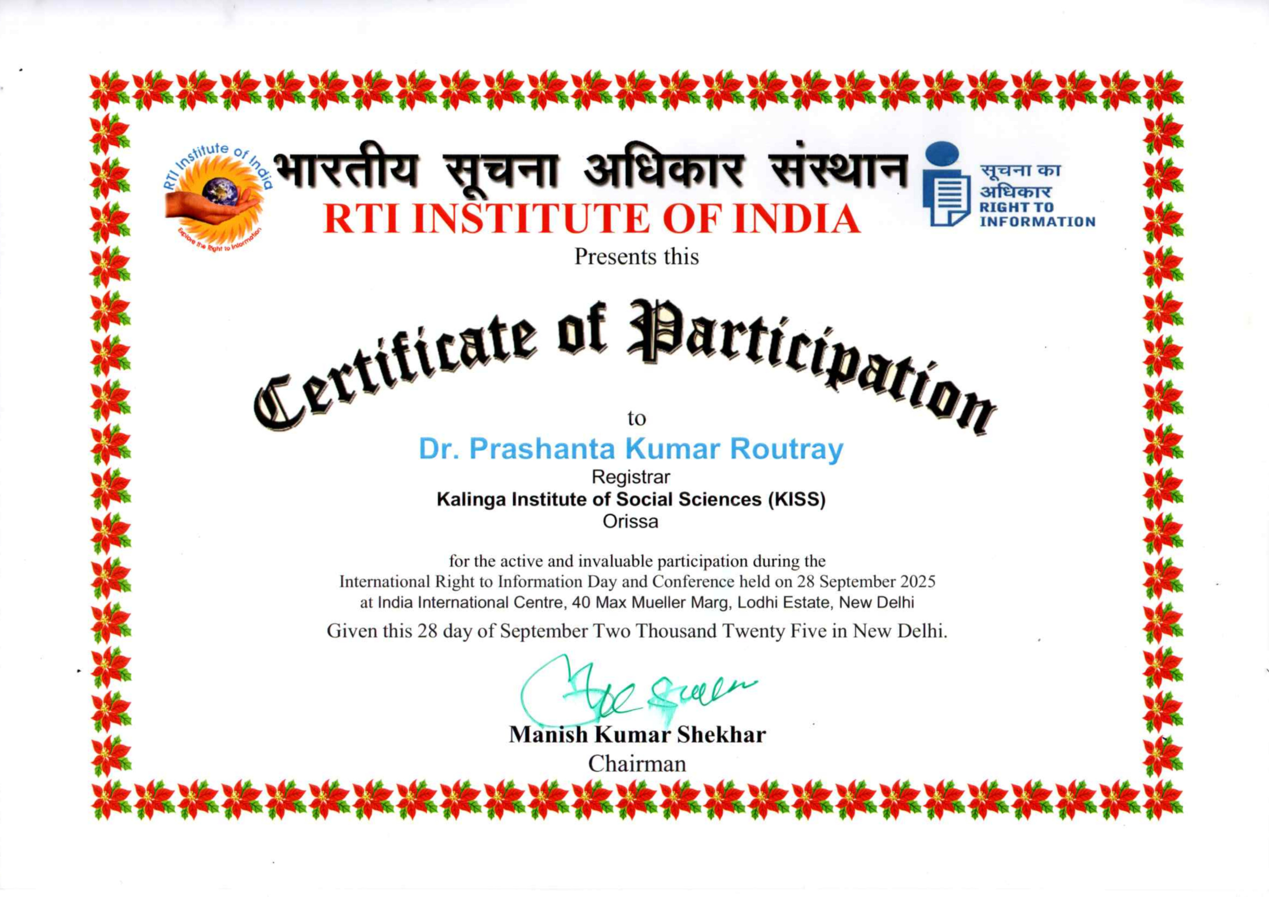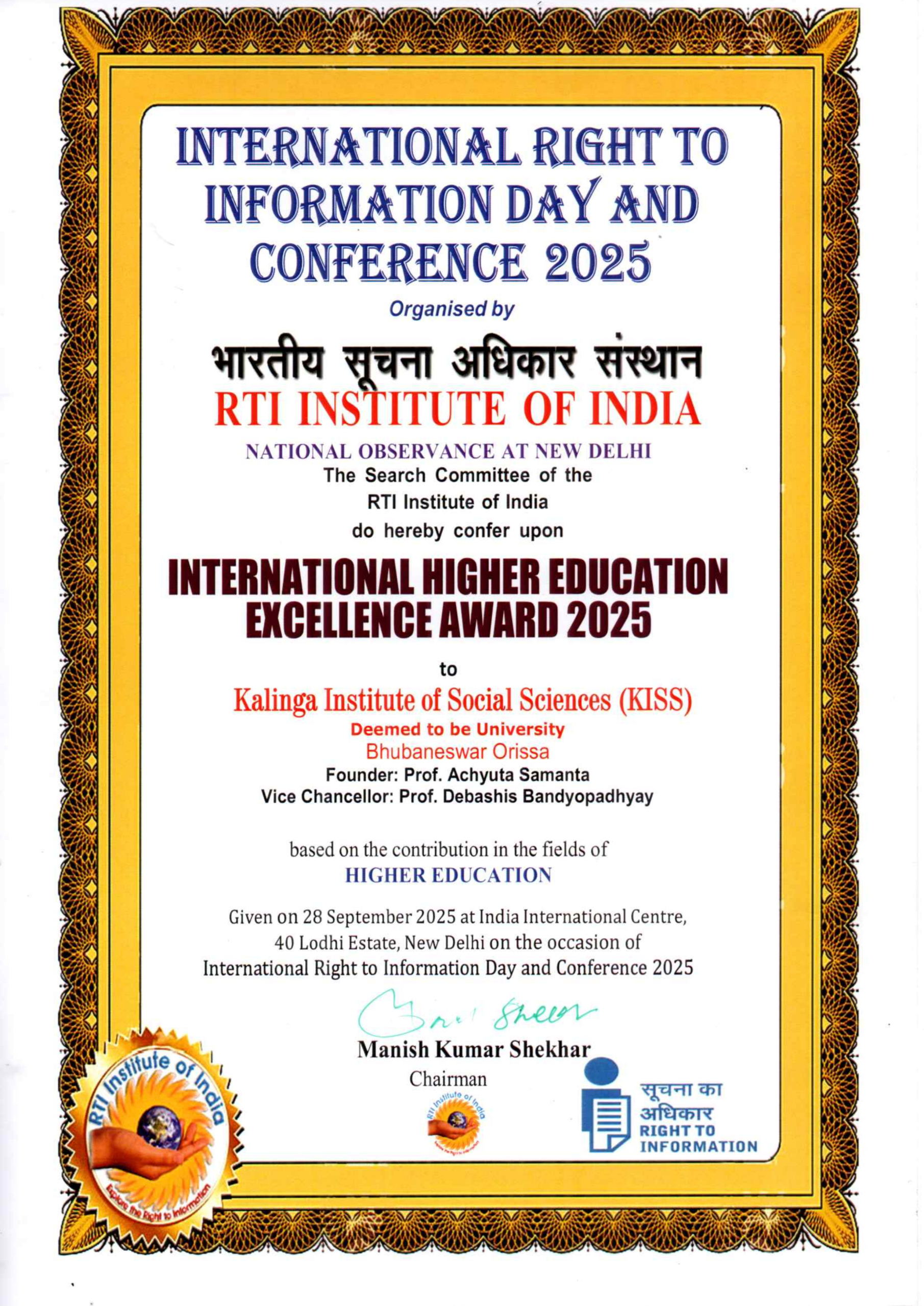 The Kalinga Institute of Social Sciences (KISS) Deemed to be University (KISS-DU) received the prestigious International Higher Education Excellence Award – 2025 during International Right to Information Day and Conference by the RTI Institute of India on 28th September 2025. Dr. Prashanta Kumar Routray, Registrar, KISS-DU represented the University and received the award on behalf of Hon’ble Founder KISS & KIIT, Dr. Achyuta Samanta at India International Centre, New Delhi.