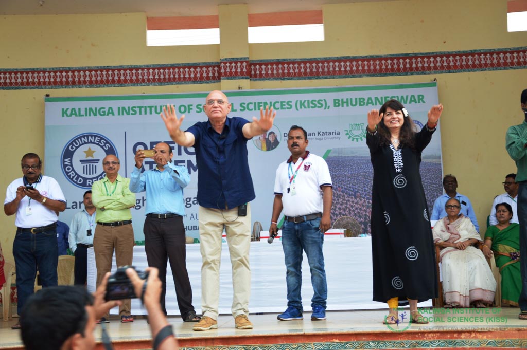 Kalinga Institute of Social Sciences (KISS) creates another world record in attending Largest Laughter Yoga Class in the world on 29th August 2017. 15,991 Students performed laughter Yoga with Guru of Giggling Dr. Madan Kataria to create Guinness World Record. After verifying all the criteria of the largest Laughter Yoga Class, the official of Guinness World Records Swapnil Dangarikar presented a certificate to Dr. Achyuta Samanta, Founder, KIIT & KISS for the achievement. The past Guinness Record in laughter Yoga was 1126. Previously, KISS has set Double Guinness World Records by forming the longest human chain and largest human sentence in the world by indigenous people. KISS is the pride of Odisha, glory of India and wonder of the world, said Dr. Samanta, while congratulating the students for the successful Largest Laughter Yoga Class and the world record. Among others Prof. Madhuri Kataria, Smt. Saswati Bal, President, KIIT & KISS; R. N. Dash, Secretary and Dr. P. K. Routray, CEO were also present on this occasion.