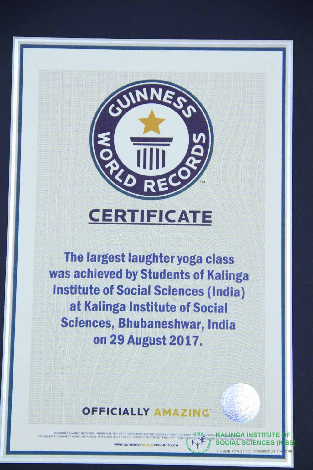 Kalinga Institute of Social Sciences (KISS) creates another world record in attending Largest Laughter Yoga Class in the world on 29th August 2017. 15,991 Students performed laughter Yoga with Guru of Giggling Dr. Madan Kataria to create Guinness World Record. After verifying all the criteria of the largest Laughter Yoga Class, the official of Guinness World Records Swapnil Dangarikar presented a certificate to Dr. Achyuta Samanta, Founder, KIIT & KISS for the achievement. The past Guinness Record in laughter Yoga was 1126. Previously, KISS has set Double Guinness World Records by forming the longest human chain and largest human sentence in the world by indigenous people. KISS is the pride of Odisha, glory of India and wonder of the world, said Dr. Samanta, while congratulating the students for the successful Largest Laughter Yoga Class and the world record. Among others Prof. Madhuri Kataria, Smt. Saswati Bal, President, KIIT & KISS; R. N. Dash, Secretary and Dr. P. K. Routray, CEO were also present on this occasion.