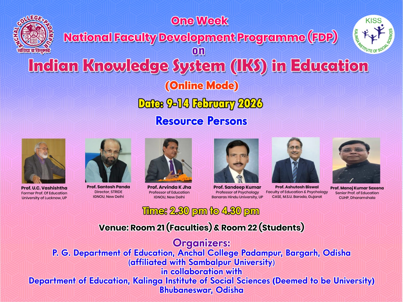 A Faculty Development Programme (FDP) was jointly organized by the PG Department of Education, Anchal College, in collaboration with the Department of Education, Kalinga Institute of Social Sciences, in online mode from 9th to 14th February 2026.