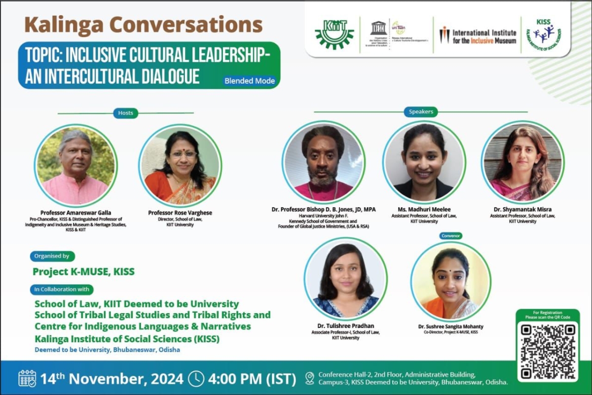 - Inclusive Cultural Leadership–An Intercultural Dialogue at KISS: https://university.kiss.ac.in/posts/kalinga-conversations-5-inclusive-cultural-leadership-an-intercultural-dialogue-at-kiss/ KISS’s Project K-MUSE, in collaboration with KIIT School of Law, hosted the fifth edition of Kalinga Conversations under the theme “Inclusive Cultural Leadership–An Intercultural Dialogue.” The event was organized in association with the School of Tribal Legal Studies and Tribal Rights and the Centre for Indigenous Languages & Narratives, KISS-DU. This interdisciplinary forum emphasized the importance of cultural inclusivity and leadership, highlighting the relevance of living cultures and traditions in a global context.