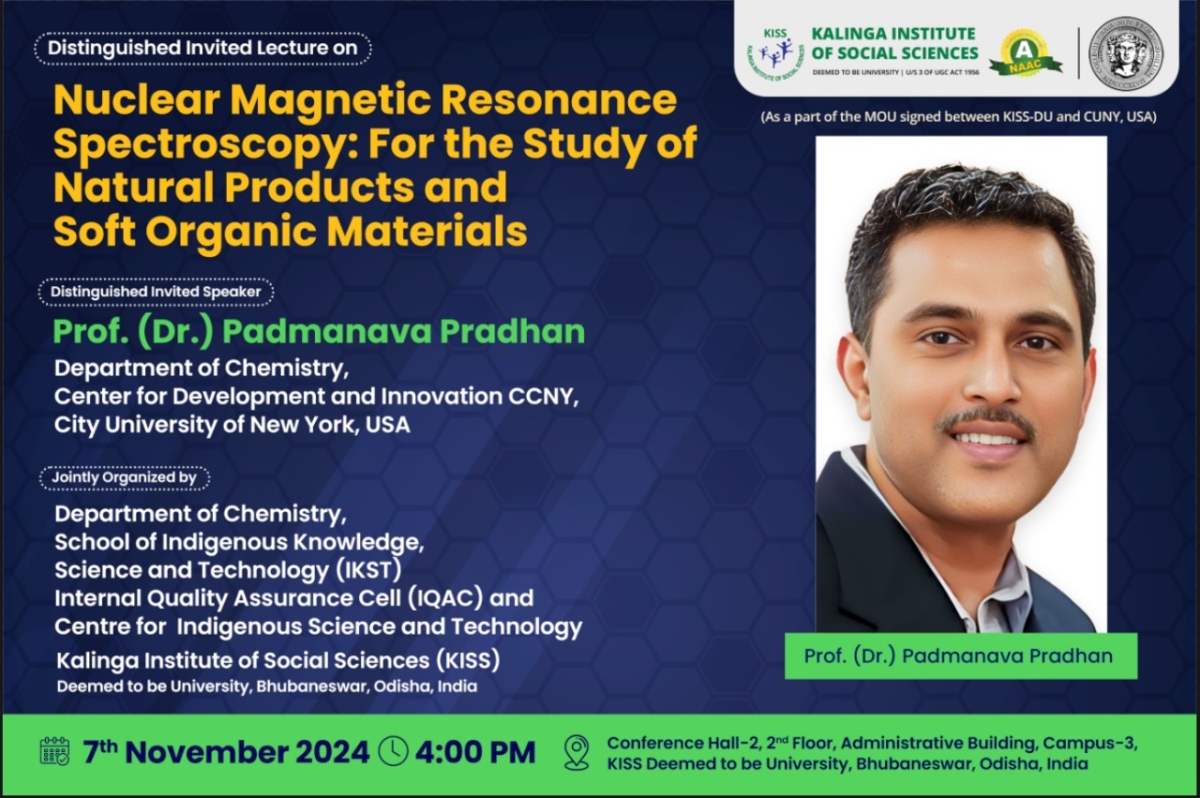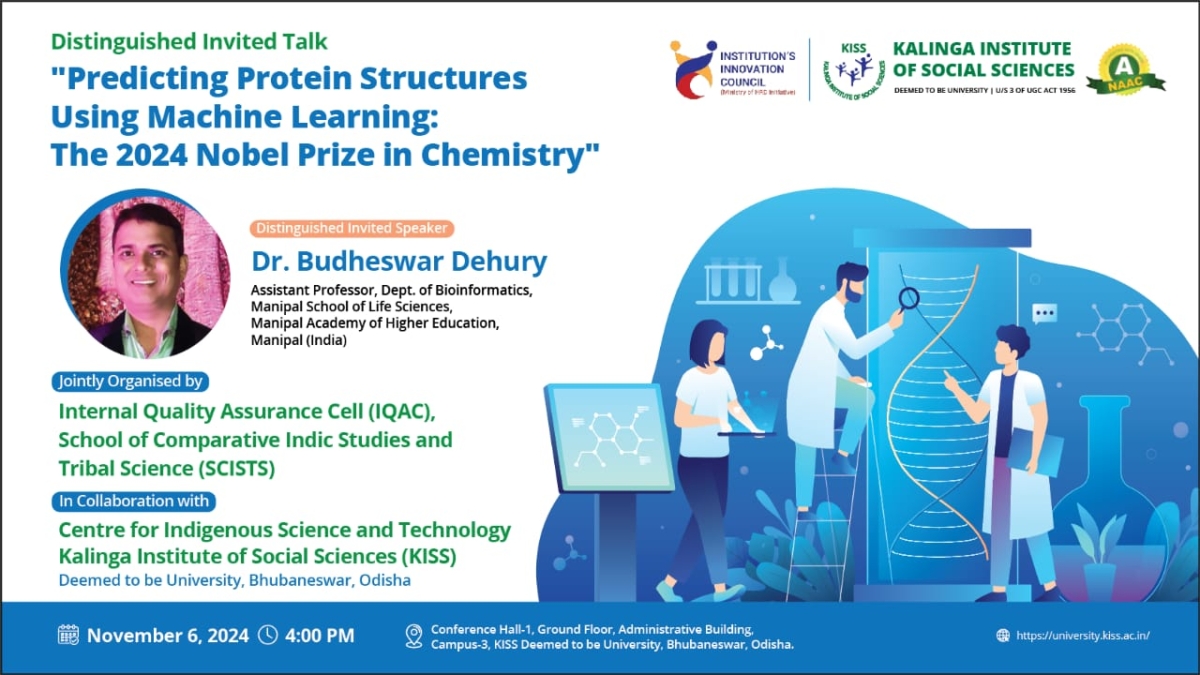 The KISS Deemed to be University (KISS-DU) hosted a distinguished invited lecture titled “Predicting Protein Structures Using Machine Learning: The 2024 Nobel Prize in Chemistry”, presented by Dr. Budheswar Dehury, Assistant Professor in the Department of Bioinformatics, Manipal Academy of Higher Education (MAHE). This event was organized by the Centre for Indigenous Science and Technology (CIST) and the School of Comparative Indic Studies and Tribal Science (SCISTS) on 6th November 2024. - Distinguished Invited Lecture on “Nuclear Magnetic Resonance (NMR) Spectroscopy: For the Study of Natural Products and Soft Organic Materials” https://university.kiss.ac.in/posts/distinguished-invited-lecture-on-nuclear-magnetic-resonance-nmr-spectroscopy-for-the-study-of-natural-products-and-soft-organic-materials/
