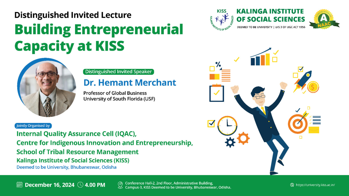 - Distinguished invited lecture on “Building Entrepreneurial Capacity at KISS” https://university.kiss.ac.in/posts/kiss-du-organizes-distinguished-invited-lecture-on-building-entrepreneurial-capacity-at-kiss/ A distinguished invited lecture on “Building Entrepreneurial Capacity at KISS” was held at Kalinga Institute of Social Sciences (KISS) on 16th December 2024. The event was jointly organized by the Internal Quality Assurance Cell (IQAC), the Center for Indigenous Innovation and Entrepreneurship (CIIE), and the School of Tribal Resource Management (STRM), KISS-DU. Dr. Hemant Merchant, Professor of Global Business, University of South Florida (USF) was invited as the esteemed speaker.